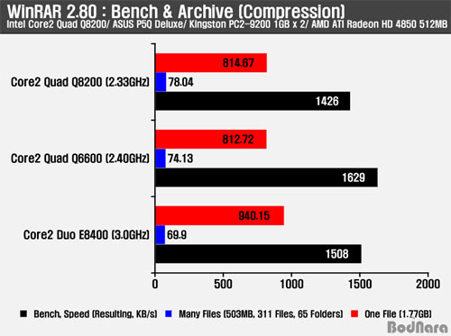 ÆÄÀÏ ¾ÐÃàÀº ¸ÖƼ ½º·¹µå¸¦ Áö¿øÇÏ´Â WinRAR 2.80 ¹öÀüÀ» Ȱ¿ëÇÏ¿© ³»ºÎ Å×½ºÆ®¿Í ½ÇÁ¦ ÆÄÀÏÀ» ¾ÐÃàÇÏ´Â ÀÛ¾÷À» ¸ðµÎ ´Ù·ç¾ú´Ù. Q8200Àº º¥Ä¡¸¶Å© Å×½ºÆ®¿Í ½ÇÁ¦ ¾ÐÃà Å×½ºÆ® ¸ðµÎ¿¡¼ Ŭ·°ÀÌ ³ôÀº Q6600À» ¾Õ¼Áö´Â ¸øÇÏ¿´À¸³ª ±× Â÷ÀÌ´Â Å« ÆøÀ¸·Î ³ªÅ¸³ªÁö ¾Ê¾ÒÀ¸¸ç, °íŬ·°ÀÇ µà¾ó ÄÚ¾î¿Í ºñ±³ÇÏ¿© º¥Ä¡¸¶Å©³ª ´Ù¼ö ÆÄÀÏ¿¡¼´Â µÚÁ³°í ÇϳªÀÇ Å« ÆÄÀÏ ¾ÐÃàÀº °íŬ·° µà¾ó Äھ´Ù Äõµå Äھ Àü¹ÝÀûÀ¸·Î À¯¸®ÇÏ°Ô ³ªÅ¸³µ´Ù.