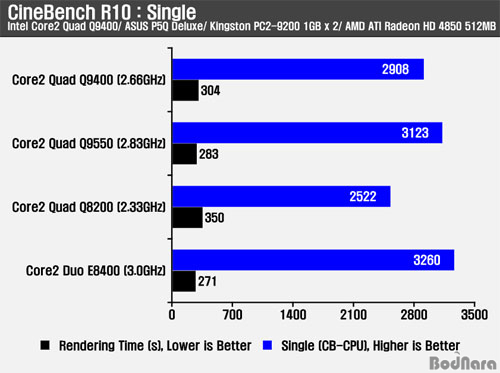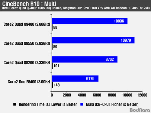 CPU ·»´õ¸µ ¼º´ÉÀ» È®ÀÎÇÒ ¼ö ÀÖ´Â CineBench R10Àº ½Ì±Û°ú ¸ÖƼÄÚ¾î·Î ³ª´©¾î ·»´õ¸µ ¼º´ÉÀ» Å×½ºÆ®Çϴµ¥ ½Ì±ÛÄÚ¾î ·»´õ¸µÀº Ŭ·°ÀÌ ³ôÀº CPU°¡ À¯¸®ÇÏ°í ¸ÖÆ¼ÄÚ¾î ·»´õ¸µÀº ÄÚ¾î ¼ö¿Í Ŭ·°ÀÌ ³ôÀ»¼ö·Ï À¯¸®ÇØÁø´Ù. Å×½ºÆ® °á°ú ½Ì±Û󸮿¡¼´Â °¡Àå Ŭ·°ÀÌ ³ôÀº µà¾óÄÚ¾î E8400ÀÇ Ã³¸® ¼º´ÉÀÌ °¡Àå ³ô¾Ò°í ÀÌ¾î¼ Q9550, ±×¸®°í Q9400, Q8200 ¼øÀ¸·Î À̾îÁ³´Ù. ¸ÖƼ󸮿¡¼´Â Q9550, Q9400, Q8200, E8400 ¼øÀ¸·Î ³ªÅ¸³µÀ¸¸ç, Q9400Àº L2 ij½¬ 2¹è ¸¹Àº Q9550°ú ºñ±³ÇÏ¿© ³·Àº Ŭ·°°ú Àý¹ÝÀÇ L2 ij½¬¸¦ Á¦°øÇÏ¿© ó¸® ¼º´ÉÀÌ »ó´ëÀûÀ¸·Î ³·¾ÆÁö³ª ¸ÞÀνºÆ®¸² ÄõµåÄÚ¾î Q8200À̳ª °íŬ·° µà¾óÄÚ¾î ´ëºñ ³ôÀº ¼º´ÉÀ» Á¦°øÇÑ´Ù.