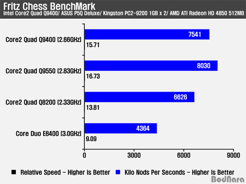 Fritz Chess Benchmark´Â CPUÀÇ ±âº» ¿¬»ê ¼º´ÉÀ» È®ÀÎÇØº¼ ¼ö ÀÖ´Â ÇÁ·Î±×·¥À¸·Î ¸ÖƼÄÚ¾î CPU¸¦ Áö¿øÇϰí ÀÖ´Ù. µû¶ó¼, µà¾óÄھ´Ù´Â ÄõµåÄھ ´õ ³ôÀº ó¸® ¼º´ÉÀ» È®ÀÎÇÒ ¼ö ÀÖÀ¸¸ç, ó¸® °á°ú ¿ª½Ã À̸¦ ¹Ý¿µÇÏ¿© ÄõµåÄÚ¾î CPUµéÀÌ À¯¸®ÇÏ¿´°í Q9400Àº Ŭ·°°ú L2 ij½¬°¡ 2¹è ´õ ¸¹Àº Q9550º¸´Ù´Â ¶³¾îÁö³ª Q8200/ E8400º¸´Ù ó¸® ¼º´ÉÀÌ ³ô´Ù.