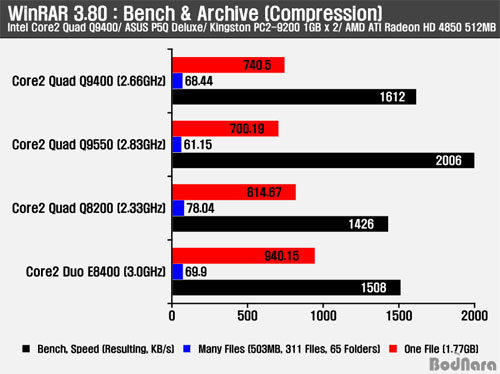 ÆÄÀÏ ¾ÐÃàÀº CPU ¼º´ÉÀÌ ¿µÇâÀ» Áִµ¥ ¸ÖƼ ½º·¹µå¸¦ Áö¿øÇÏ´Â WinRAR 3.80 ¹öÀüÀ» Ȱ¿ëÇÏ¿© ÇÁ·Î±×·¥ ÀÚüÀÇ Å×½ºÆ®¿Í ½ÇÁ¦ ÆÄÀÏÀ» ¾ÐÃàÇÏ´Â ÀÛ¾÷À» ¸ðµÎ ´Ù·ç¾ú´Ù. Q9400Àº º¥Ä¡¸¶Å©¿¡¼´Â °íŬ·° µà¾óÄÚ¾îÀÎ E8400°ú Q8200À» ¾Õ¼¹À¸¸ç, Ŭ·°°ú L2 ij½¬°¡ ´Ã¾î³ Q9550°ú´Â ²Ï ¸¹Àº Â÷À̸¦ º¸¿´´Ù. ½ÇÁ¦ ¾ÐÃà¿¡¼ Q9400Àº ´Ù¼ö ÆÄÀϰú ÀûÀº ¿ë·®À» ´Ù·ê °æ¿ì °íŬ·° µà¾óÄÚ¾îÀÎ E8400°ú ¸¹Àº Â÷À̸¦ º¸¿©ÁÖÁö´Â ¸øÇßÀ¸³ª ÇϳªÀÇ Å« ÆÄÀÏÀ» ¾ÐÃàÇÏ´Â °æ¿ì´Â ²Ï ¸¹Àº Â÷À̸¦ ³ªÅ¸³Â°í ÄõµåÄÚ¾î Á¦Ç°µéÀÌ ¿ì¼öÇÏ°Ô ³ªÅ¸³µ´Ù.