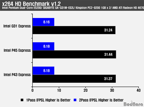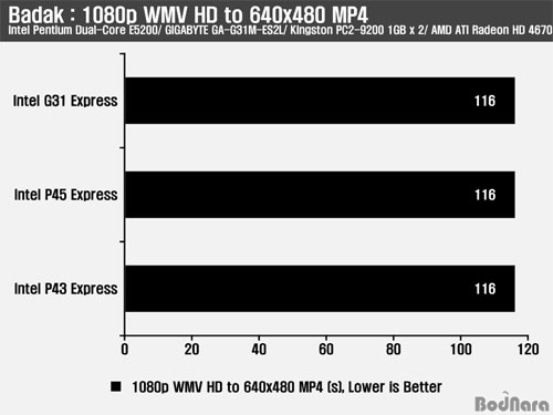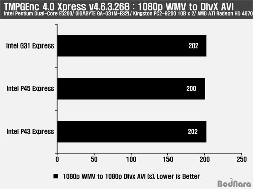 TMPGEnc 4.0 Xpress ÇÁ·Î±×·¥À» ÀÌ¿ëÇÏ¿© DivX AVI ÆÄÀÏ·Î Æ®·£½ºÄÚµùÇÏ´Â ½Ã°£À» ºñ±³Çߴµ¥ G31°ú P43Àº °°Àº ½Ã°£ÀÌ ¼Ò¿äµÇ¾ú°í P45´Â 2ÃÊ °¡·® ºü¸£°Ô ÁøÇàµÇ¾ú´Ù.