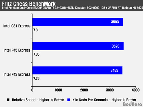 Fritz Chess Benchmark´Â CPUÀÇ ±âº» ¿¬»ê ¼º´ÉÀ» È®ÀÎÇØº¼ ¼ö ÀÖ´Â ÇÁ·Î±×·¥À̸ç, ¸ÖƼÄÚ¾î CPU¸¦ Áö¿øÇϴµ¥ G31/ P43/ P45 3Á¾ÀÇ Ä¨¼Â¿¡ µ¿ÀÏÇÑ CPU¿Í ¸Þ¸ð¸®, ±×·¡ÇÈ Ä«µå¸¦ »ç¿ëÇÑ ±¸¼ºÀº ¾Õ¼ »ìÆìº» »êµå¶óó·³ ±× Â÷À̰¡ Å©°Ô ³ªÅ¸³ªÁö ¾Ê¾Ò´Ù.
