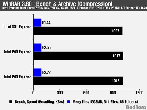 ÆÄÀÏ ¾ÐÃàÀº CPU¿Í ½Ã½ºÅÛ ¼º´ÉÀÌ ¿µÇâÀ» Áִµ¥ ¸ÖƼ ½º·¹µå¸¦ Áö¿øÇÏ´Â WinRAR 3.80 ¹öÀüÀ» Ȱ¿ëÇÏ¿© ÇÁ·Î±×·¥ ÀÚüÀÇ Å×½ºÆ®¿Í ½ÇÁ¦ ÆÄÀÏÀ» ¾ÐÃàÇÏ´Â ½Ã°£À» ºñ±³Çß´Ù. º¥Ä¡¸¶Å©¿¡¼´Â 3Á¾ Ĩ¼Â Áß P45/ P43/ G31 ¼øÀ¸·Î ³ªÅ¸³µ°í ½ÇÁ¦ ¾ÐÃà¿¡¼´Â G31 (91ÃÊ 44)/ P45/ P43 ¼øÀ¸·Î ³ªÅ¸³µÀ¸³ª À̹ø °á°ú ¿ª½Ã 3Á¾ Ĩ¼Âµé °£ÀÇ °ÝÂ÷´Â Å©Áö ¾Ê´Ù.