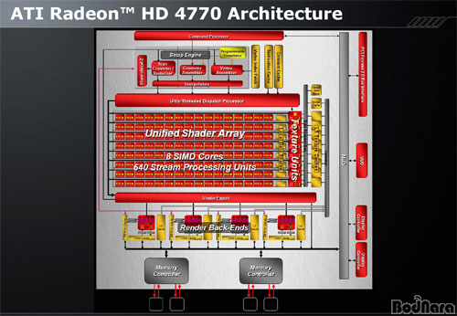 Radeon HD 4770Àº 640°³ÀÇ ½ºÆ®¸² ÇÁ·Î¼¼¼ (640 SP), ÅØ½ºÃ³ À¯´Ö 32, ROP16 À¯´ÖÀ» Á¦°øÇÏ¿© HD 4830°ú´Â ±âº» ½ºÆå»óÀ¸·Î´Â Â÷À̰¡ ¾øÀ¸³ª 40nm °øÁ¤ Àû¿ë¿¡ µû¶ó ½ºÆå¸¸ ÁÙÀÎ HD 4830º¸´Ù 30W °¡·®ÀÌ ´õ ³·¾ÆÁø 80W TDP (¿¼³°è Àü·Â)¸¦ Á¦°øÇÏ¿© ¹Ì¼¼°øÀûÀÇ ´öÀ» º¸°í ÀÖ´Ù. ¶ÇÇÑ, Ŭ·°µµ ÄÚ¾î 750/ ¸Þ¸ð¸® 3200 (800)MHz·Î Áõ°¡µÇ¾ú°í ¸Þ¸ð¸® ÀÎÅÍÆäÀ̽º´Â 128bit·Î ³·¾ÆÁ³Áö¸¸, °íŬ·°ÀÇ GDDR5 ¸Þ¸ð¸®¸¦ »ç¿ëÇÏ¿© ºÎÁ·ÇÑ ¸Þ¸ð¸® ´ë¿ªÆø È®º¸¸¦ ÅëÇØ ¼º´É ÀúÇϸ¦ ÃÖ¼ÒÈÇϰí ÀÖ´Ù. ¸Þ¸ð¸® ´ë¿ªÆøÀº Radeon HD 4670ÀÌ °í¼º´É Á¦Ç°µéÀÇ °ÅÀÇ Àý¹Ý ´ë¿ªÆøÀ» Á¦°øÇÏ´Â °Í°ú ´Þ¸® »óÀ§ Á¦Ç°±º¿¡ »ó´ç ºÎºÐ ±ÙÁ¢ÇÑ ´ë¿ªÆøÀ» Á¦°øÇÑ´Ù.