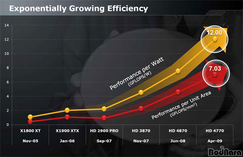 Radeon HD 4770Àº ¸éÀû ´ç ¼º´É°ú ¿ÍÆ® ´ç ¼º´ÉÀÌ Áö±Ý±îÁö µîÀåÇÑ Á¦Ç°µé°ú ºñ±³ÇÏ¿© 40nmÀÇ ¹Ì¼¼°øÁ¤À» ÅëÇØ °¡Àå ¿ì¼öÇÑ È¿À²À» °¡Áö°í ÀÖ´Ù.