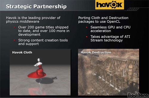 AMD ATI´Â GPU º´·Ä ÄÄÇ»ÆÃÀ» À§ÇÑ GPGPU ±â¼úÀ» À§ÇØ °ø°³ Ç¥ÁØÀÎ OpenCLÀ» ±âº»À¸·Î äÅÃÇϰí ÀÖÀ¸¸ç, À̸¦ À§ÇÑ ±â¼ú·Î NVIDIA CUDA¿¡ ´ëÀÀµÇ´Â ATI StreamÀ» Á¦°øÇϰí ÀÖ´Ù. ¶Ç, ÃÖ±Ù¿¡´Â ÀÎÅÚÀÌ ÀμöÇÑ ÇϺ¹ÀÇ ¹°¸®¿£ÁøÀ» OpenCLÀ» ÅëÇØ ATI Stream Áö¿ø GPU¸¦ ÀÌ¿ëÇÑ Çϵå¿þ¾î °¡¼Óµµ ½Ã¿¬Çß´Ù. AMD ATIÀÇ GPU¾Æ CPU °¡¼ÓÀÇ È¿À²ÀûÀÎ ·Îµå¹ë·±½ÌÀ» À§ÇÑ ³ë·ÂµéÀÌ ÀÌ·ç¾îÁö°í ÀÖ¾î NVIDIA PhysX¿¡ ´ëÀÀµÇ´Â Çϵå¿þ¾î·Î °¡¼ÓµÇ´Â ÇϺ¹ µî°ú °°Àº ¹°¸®¿£ÁøÀ» Àû¿ëÇÑ °ÔÀÓµéÀÇ µîÀåµµ ±â´ëÇØº¼ ¼ö ÀÖ°Ô µÇ°í ÀÖ´Ù.