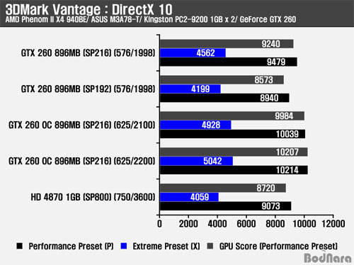 3DMark Vantage´Â DirectX 10 ȯ°æ¿¡¼ ±×·¡ÇÈ Ä«µåÀÇ ±âº» ¼º´ÉÀ» ºñ±³ÇÒ ¼ö Àִµ¥ Áö³ SP800 vs SP640 Radeon HD 4830ÀÇ °á°úó·³ °°Àº Ŭ·°ÀÌ¶óµµ ½ºÆ®¸² ÇÁ·Î¼¼¼ÀÇ ¼ö°¡ Áõ°¡µÉ °æ¿ì ±×¿¡ µû¸¥ ¼º´É Â÷°¡ ³ªÅ¸³´Ù. °æÀï Á¦Ç°ÀÎ Radeon HD 4870 1GB¿Í ºñ±³ÇÏ¿© SP216 GeForce GTX 260Àº Àü¹ÝÀûÀ¸·Î ´õ ³ôÀº ¼º´ÉÀ» ³ªÅ¸³ÂÀ¸¸ç, SP216 GeForce GTX 260 OC (ÄÚ¾î 625/ ¸Þ¸ð¸® 2100 (1050)MHz, 625/ 2200 (1100)MHz) ¹öÀüµéÀº ¼º´É¿¡ ¿µÇâÀ» ÁÖ´Â ½ºÆ®¸² ÇÁ·Î¼¼¼¿Í Ŭ·° Áõ°¡°¡ ¸ðµÎ ÀÌ·ç¾îÁ® SP216 GeForce GTX 260 ·¹ÆÛ·±½º Ŭ·° Àû¿ëº¸´Ù ´õ ³ôÀº ½ºÄھ ±â·ÏÇß´Ù.