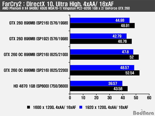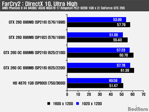 FarCry2µµ 3DMark Vantage¿Í °°ÀÌ DirectX 10 ȯ°æ¿¡¼ Å×½ºÆ®°¡ ÁøÇàµÇ¾úÀ¸¸ç, °°Àº Ŭ·°À» Àû¿ëÇÏ¿´À» ¶§ SP216 GeForce GTX 260ÀÇ ¼º´ÉÀÌ SP192 GeForce GTX 260º¸´Ù ´õ ³ªÀº ÇÁ·¹ÀÓÀ» Á¦°øÇÑ´Ù. À̹ø Å×½ºÆ®¿¡¼µµ °æÀï Á¦Ç°À¸·Î º¼ ¼ö ÀÖ´Â Radeon HD 4870 1GBº¸´Ù SP192/ SP216 GeForce GTX 260ÀÌ ´õ ³ªÀº ÇÁ·¹ÀÓÀ» Á¦°øÇßÀ¸¸ç, ¿À¹öŬ·°µÈ SP216 GeForce GTX 260 µÎ Á¦Ç°µµ ¼º´É Çâ»óÀÌ ÀÌ·ç¾îÁ³´Ù.