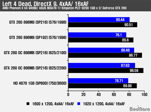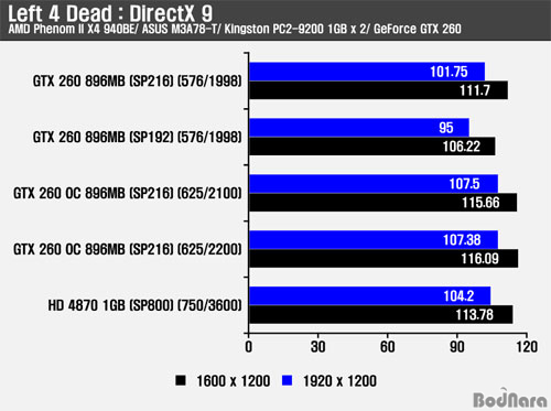 Left 4 Dead´Â ´Ù¸¥ °ÔÀÓ ¹× º¥Ä¡¸¶Å©¿Í ´Þ¸® DirectX 9 ȯ°æ¿¡¼ Å×½ºÆ®¸¦ ÁøÇàÇßÀ¸¸ç, Radeon ±×·¡ÇÈ Ä«µåµé¿¡ ÃÖÀûÈµÈ ¼º´ÉÀ» ³»Áִµ¥ À̹ø °á°úµµ 3DMark Vantage¿Í FarCry2 °ÔÀÓ°ú ´Þ¸® Radeon HD 4870 1GB°¡ SP192/ SP216 GeForce GTX 260°ú ºñ±³ÇÏ¿© Àü¹ÝÀûÀ¸·Î ´õ ³ªÀº ÇÁ·¹ÀÓÀ» Á¦°øÇßÀ¸¸ç, ¾ÈƼ¾Ù¸®¾î½Ì (AA, Anti-Aliasing)°ú ºñµî¹æ¼ºÇÊÅ͸µ (AF, Anisotropic Filtering)À» Àû¿ëÇÏ¿´À» ¶§´Â SP216 GeForce GTX 260º¸´Ù ¾à°£ ³·Àº ÇÁ·¹ÀÓÀ» º¸¿©ÁØ´Ù. ¿À¹öŬ·°µÈ SP216 GeForce GTX 260 µÎ Á¦Ç°Àº ½ºÆ®¸² ÇÁ·Î¼¼¼¿Í Ŭ·°ÀÇ Áõ°¡·Î °íÇØ»óµµ¿Í AA/ AF Àû¿ë½Ã ´õ ³ªÀº ÇÁ·¹ÀÓÀ» Á¦°øÇß´Ù.