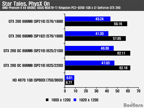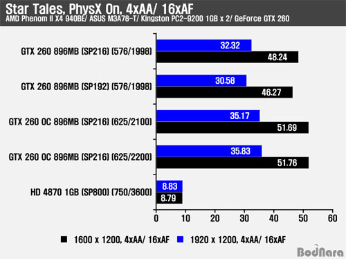 À̹ø¿¡´Â PhysX °¡¼Ó ¼º´ÉÀ¸·Î ¿ø´õ°É½º ³ë¹Ùµð¸¦ ºÎ¸£´Â ¿©¼º ij¸¯Å͵é·Î ±¸¼ºµÈ Star Tales º¥Ä¡¸¶Å©¸¦ µ¿ÀÛÇÏ¿© ¼º´ÉÀ» ºñ±³Çß´Ù. À̹ø Å×½ºÆ®µµ µ¿ÀÏ Å¬·°ÀÇ SP216 GeForce GTX 260Àº SP192 GeForce GTX 260º¸´Ù ³ªÀº ÇÁ·¹ÀÓÀ» Á¦°øÇØÁÖ°í ÀÖÀ¸¸ç, ¿À¹öŬ·° ¹öÀüÀº ÀÌÀüÀÇ °á°úµéó·³ Ŭ·° Áõ°¡¿¡ µû¶ó ´õ ³ôÀº ÇÁ·¹ÀÓÀ» Á¦°øÇß´Ù. PhysX °¡¼ÓÀ» Áö¿øÇÏÁö ¸øÇÏ´Â Radeon HD 4870 1GB´Â CPUÀÇ PhysX ó¸® ¼º´ÉÀ¸·Î ºñ±³µÇ¾î ÇÁ·¹ÀÓ Â÷À̰¡ Å©°Ô ³ªÅ¸³´Ù. PhysX º¥Ä¡¸¶Å©ÀÇ °æ¿ì AA/ AF¸¦ Àû¿ëÇÏÁö ¾ÊÀ» °æ¿ì ¾Õ¼ÀÇ °ÔÀÓÀ̳ª º¥Ä¡¸¶Å©ÀÇ °á°úº¸´Ù ½ºÆ®¸² ÇÁ·Î¼¼¼ Áõ°¡¿¡ µû¸¥ ¼º´É Çâ»óÀÌ ¾à°£ ´õ ³·°Ô ³ªÅ¸³ª°í ÀÖ´Ù.