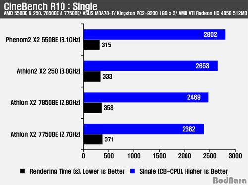 CPU ·»´õ¸µ ¼º´ÉÀº ¸ÖƼÄÚ¾î CPU¸¦ Áö¿øÇϰí ÀÖ´Â Cinema 4D ±â¹ÝÀÇ º¥Ä¡¸¶Å© ÇÁ·Î±×·¥ÀÎ CineBench R10À» ÀÌ¿ëÇÏ¿© ÁøÇàÇß´Ù.  ÇϳªÀÇ ÄھÀ» »ç¿ëÇÏ¿© ·»´õ¸µÀ» ÁøÇàÇÏ´Â ½Ì±Û Å×½ºÆ®¿¡¼´Â Ŭ·°ÀÌ °¡Àå ³ôÀº Æä³Ñ2 X2 550BE (3.1GHz)°¡ °¡Àå ºü¸¥ ó¸® ½Ã°£°ú 󸮷®À» Á¦°øÇßÀ¸¸ç, ÄÚ¾î 2°³¸¦ ¸ðµÎ Ȱ¿ëÇÏ´Â ¸ÖƼ Å×½ºÆ®¿¡¼µµ ½Ì±ÛÀ» ÀÌ¾î °¡Àå ³ôÀº Ŭ·°À» °¡Áø Æä³Ñ2 X2 550BE°¡ ¿ì¼öÇÑ °á°ú¸¦ º¸¿©ÁÖ¾ú´Ù. 45nm ±â¹Ý µà¾óÄÚ¾î 2Á¾Àº 65nm ±â¹Ý µà¾óÄÚ¾î 2Á¾º¸´Ù Àü¹ÝÀûÀΠó¸® ¼º´ÉÀÌ ¿ì¼öÇß´Ù.       ¾ÐÃà ¼º´É