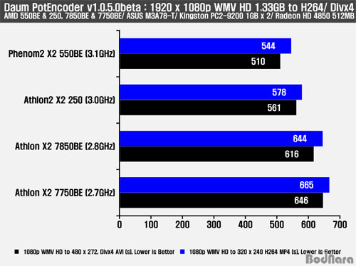 ÀçÀÎÄÚµù (Æ®·£½ºÄÚµù)Àº ´Ù¾çÇÑ ÈÞ´ë±â±â¸¦ À§ÇÑ ÀÎÄÚµù ¿É¼Ç°ú °£´ÜÇÑ ÆíÁý, ±×¸®°í ¸ÖƼÄÚ¾î CPU¸¦ Áö¿øÇÏ´Â ¹«·á ÀÎÄÚµù ¼ÒÇÁÆ®¿þ¾îÀÎ ´ÙÀ½ ÆÌÀÎÄÚ´õ¸¦ ÀÌ¿ëÇß´Ù. »ùÇÃÀº The Living Sea WMV HD 1920 x 1080p 1.33GB ¿ë·®ÀÇ ÀÎÅÚ È«º¸ ¿µ»óÀ» ÈÞ´ë ±â±â¿¡ ÀûÇÕÇÑ H264 ÄÚµ¦ (320 x 240 MP4 Æ÷¸Ë)°ú ÀÏ¹Ý PC µî¿¡ »ç¿ëµÇ´Â OpenDivx (DivX4) ÄÚµ¦ (480 x 272 AVI)À» ÀÌ¿ëÇÑ ÀçÀÎÄÚµù ½Ã°£À» ºñ±³Çß´Ù. ¸ÖƼÄÚ¾î CPU¸¦ Áö¿øÇÏ´Â ´ÙÀ½ ÆÌÀÎÄÚ´õ´Â ÀÎÄÚµù Áß µÎ °³ÀÇ ÄÚ¾î ¸ðµÎ°¡ °ÅÀÇ 100%·Î µ¿À۵Ǿî ó¸® ¼º´ÉÀÌ ºü¸£¸ç, 45nm °øÁ¤°ú °¡Àå ³ôÀº 3.1GHzÀÇ Å¬·°À» °¡Áø Æä³Ñ2 X2 550BE°¡ °¡Àå ºü¸¥ ½Ã°£ ³»¿¡ ÀçÀÎÄÚµùÀ» ³¡¸¶ÃÆ´Ù. Ŭ·°ÀÌ ³·°í L3 ij½¬°¡ Á¦°ÅµÈ Athlon2 X2 250Àº 65nm ±â¹Ý µà¾óÄÚ¾î 2Á¾Àº °¡º±°Ô ³Ñ¾î¼¹À¸³ª Æä³Ñ2 X2 550BEº¸´Ù´Â ´À¸° ó¸® ¼º´ÉÀ» º¸¿©ÁØ´Ù. |