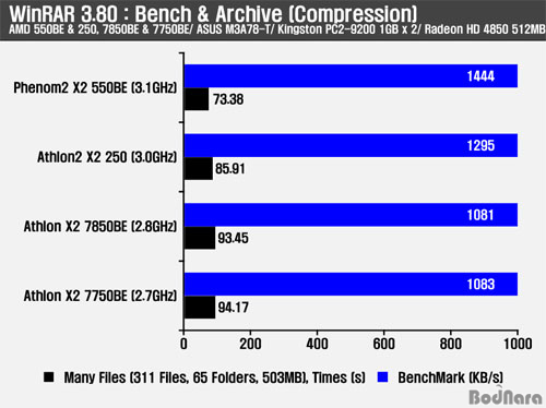 ¾ÐÃà ¼º´É Å×½ºÆ®´Â WinRAR 3.80À» ÀÌ¿ëÇßÀ¸¸ç, ´Ù¼öÀÇ ÆÄÀϰú Æú´õ¸¦ Æ÷ÇÔÇÑ »ùÇà ÆÄÀϵéÀ» ÀÌ¿ëÇÑ ¾ÐÃà½Ã°£°ú ³»ÀåµÈ º¥Ä¡¸¶Å© °á°ú¸¦ ºñ±³Çß´Ù. WinRARÀº ¸ÖƼ ½º·¹µå¸¦ Áö¿øÇϰí ÀÖ¾î µà¾óÄÚ¾î ÀÌ»óÀÇ CPU¸¦ »ç¿ëÇÒ °æ¿ì ¾ÐÃà ½Ã°£À» ´ÜÃà½Ãų ¼ö ÀÖ´Ù. ¾ÐÃà Å×½ºÆ® °á°úµµ ¾Õ¼ ÁøÇàµÈ Å×½ºÆ®µé°ú Å©°Ô ´Ù¸£Áö ¾ÊÀº °á°ú¸¦ º¸¿©ÁÖ°í ÀÖÀ¸¸ç, 45nm Athlon2 X2 250Àº Æä³Ñ2 X2 550BEº¸´Ù Ŭ·°ÀÌ 100MHz ³·°í L3 ij½¬´Â Á¦¿ÜµÈ ´ë½Å L2 ij½¬°¡ 1MB ´Ã¾úÀ¸³ª Ŭ·°°ú L3 ¹ÌÁ¦°ø¿¡ µû¸¥ ¼º´É Â÷À̰¡ ³ªÅ¸³´Ù.       ÀçÀÎÄÚµù ¼º´É (Æ®·£½ºÄÚµù ¼º´É)