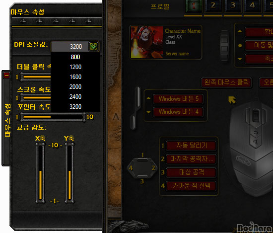 ¸¶¿ì½º ¼Ó¼º â¿¡¼´Â dpi¸¦ 800¿¡¼ºÎÅÍ 3200±îÁö ´Ü°èº°·Î Á¶ÀýÇÒ ¼ö ÀÖÀ¸¸ç, ´õºí Ŭ¸¯ ¼Óµµ¿Í ½ºÅ©·Ñ ¼Óµµ, Æ÷ÀÎÅÍ ¼Óµµ, ±×¸®°í XÃà°ú YÃàÀÇ °¨µµ¸¦ µû·Î ¼³Á¤ÇØ Àڽſ¡°Ô ¸Â´Â ÃÖÀûÀÇ ¿òÁ÷À» ¼³Á¤ÇÒ ¼ö ÀÖ´Ù. ÀÌ °¡¿îµ¥ dpi º¯°æÀº ¹öư ÇÒ´çÀ» ÅëÇØ ¸¶¿ì½º ¹öư¿¡ ¿¬°á½ÃŰ´Â °Íµµ °¡´ÉÇÏ´Ù.
