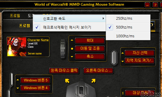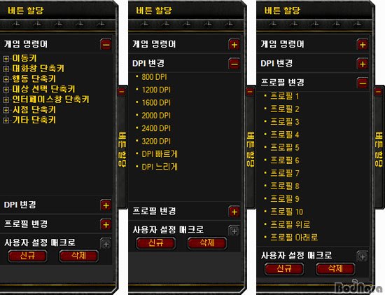 ¹öư ÇÒ´çÀº °ÔÀÓ ¸í·É¾î, DPI º¯°æ, ÇÁ·ÎÇÊ º¯°æ, ±×¸®°í »ç¿ëÀÚ ¼³Á¤ ¸ÅÅ©·Î±îÁö ÃÑ 4°³ÀÇ ¸Þ´º·Î ±¸¼ºµÇ¾î ÀÖ´Ù. °ÔÀÓ ¸í·É¾î´Â WOW °ÔÀÓ ³»¿¡¼ ´ÜÃàŰ·Î ÁöÁ¤ °¡´ÉÇÑ ¸ðµç ±â´ÉÀ» ¸Á¶óÇϰí ÀÖ¾î ¸¶¿ì½º ¹öưÀÌ ¿ÀÈ÷·Á ¸ðÀÚ¸£´Ù´Â ´À³¦±îÁö ¹Þ´Â´Ù.