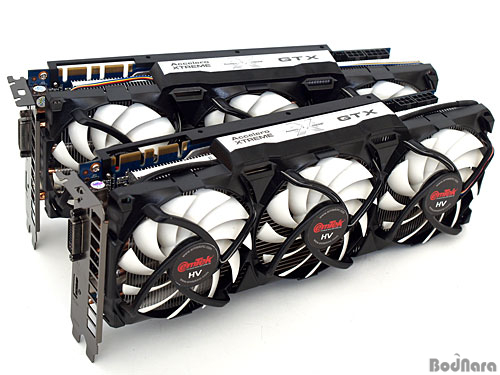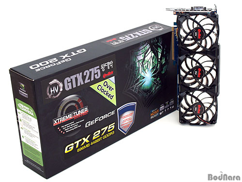 GeForce GTX 275 ¿À¹öŬ·° ¹öÀüÀº Galaxy¿¡¼ ÀÚü ¼³°èÇÑ GeForce GTX 285 PCB¸¦ ±×´ë·Î »ç¿ëÇÑ ÀÌ¿¥ÅØ GeForce GTX 275 HV O.C ¿Õ´ë¹Ú 896MB AC Xtreme (ÀÌÇÏ, GeForce GTX 275 OC) Á¦Ç°ÀÌ´Ù. GeForce GTX 275 ¿À¹öŬ·° Á¦Ç° °¡¿îµ¥¼µµ »óÀ§¿¡ ¼ÓÇϴ Ŭ·° Àû¿ë ¹× 3°³ÀÇ 92mm Ä𸵠ÆÒÀÌ ÀåÂøµÈ ¾ÆÆ½Ä𸵻çÀÇ Accelero Xtreme GTX Äð·¯°¡ ±âº»À¸·Î ÀåÂøµÇ¾î ³ôÀº 3D ¼º´É°ú Ä𸵠¼º´ÉÀ» Á¦°øÇÑ´Ù. ´Ù¸¸, Äð·¯ÀÇ Å©±â°¡ ±æÀ̰¡ ±æ±â ¶§¹®¿¡ ÀåÂø °¡´ÉÇÑ ÄÉÀ̽º¿¡ Á¦ÇÑÀÌ ÀÖ¾î ÄÉÀ̽º ¼±Åÿ¡ ÁÖÀǸ¦ ±â¿ï¿©¾ß ÇÑ´Ù.