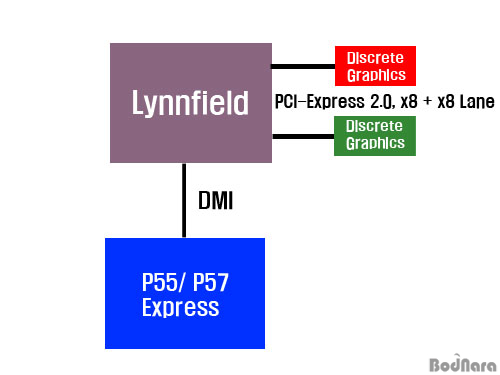 ÀÎÅÚ P55/ P57 Ĩ¼ÂÀº ¸°Çʵå CPU¿¡ µà¾óä³Î DDR3 ¸Þ¸ð¸® ÄÁÆ®·Ñ·¯, PCI-Express 2.0 Lane (x8 + x8 Lane Áö¿øÀ¸·Î AMD ATI CrossFire X¿Í NVIDIA SLI¸¦ Áö¿øÇÒ ¼ö ÀÖ´Ù. SLI Áö¿øÀº Á¦Á¶»ç¿¡ µû¶ó ¶óÀ̼¾½º¸¦ ¹ÞÀ¸¸é X58 Ĩ¼Âó·³ °¡´ÉÇØÁø´Ù.)ÀÌ ³»ÀåµÇ¹Ç·Î »ç¿ì½ººê¸´Áö ±â´ÉÀ» À§ÁÖ·Î Á¦°øÇÑ´Ù. Áï, ÀÎÅÚ 5 ½Ã¸®Áî Ĩ¼ÂÀº ÀÌ¿¡ µû¶ó ¿øÄ¨ ¼Ö·ç¼Ç ±¸¼ºÀÌ °¡´ÉÇØÁ³´Ù.