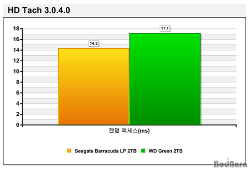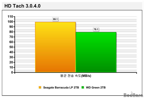 HD Tach Å×½ºÆ® °á°ú Æò±Õ Àü¼Û¼Óµµ´Â ¹Ù¶óÄí´Ù LP°¡ 99.1MB/s, WD ±×¸°¿¡µð¼ÇÀÌ 79.1MB/s·Î ¾Õ¼± Å×½ºÆ®¿Í °°ÀÌ ¹Ù¶óÄí´Ù LP°¡ WD ±×¸°¿¡µð¼Ç¿¡ ºñÇØ Æò±Õ Àü¼Û¼Óµµ°¡ ÃÊ´ç 20MB ºü¸¥ °ÍÀ¸·Î ³ªÅ¸³µÀ¸¸ç, ·£´ý ¾×¼¼½º´Â ¹Ù¶óÄí´Ù LP°¡ 14.3ms, WD ±×¸°¿¡µð¼ÇÀÌ 17.1ms·Î ¹Ù¶óÄí´Ù LP°¡ WD ±×¸°¿¡µð¼Çº¸´Ù ºü¸¥ °ÍÀ¸·Î ³ªÅ¸³µ´Ù.