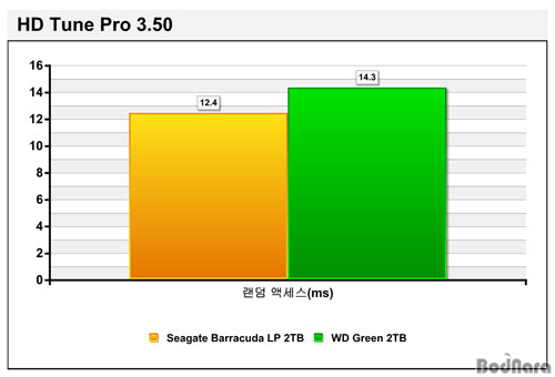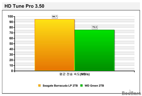 HD Tune Pro Å×½ºÆ® °á°ú Æò±Õ Àü¼Û¼Óµµ´Â ¹Ù¶óÄí´Ù LP°¡ 94.7MB/s, WD ±×¸°¿¡µð¼ÇÀÌ 75.3MB/s·Î ¹Ù¶óÄí´Ù LP°¡ WD ±×¸°¿¡µð¼Ç¿¡ ºñÇØ Æò±Õ Àü¼Û¼Óµµ°¡ ÃÊ´ç 20MBÁ¤µµ ºü¸¥ °ÍÀ¸·Î ³ªÅ¸³µÀ¸¸ç, ·£´ý ¾×¼¼½º´Â ¹Ù¶óÄí´Ù LP°¡ 12.4ms, WD ±×¸°¿¡µð¼ÇÀÌ 14.3ms·Î ·£´ý ¾×¼¼½º ŸÀÓ ¿ª½Ã ¹Ù¶óÄí´Ù LP°¡ WD ±×¸°¿¡µð¼Çº¸´Ù ÁÁÀº °á°ú°ªÀ» º¸¿´´Ù.