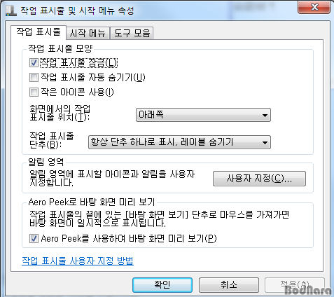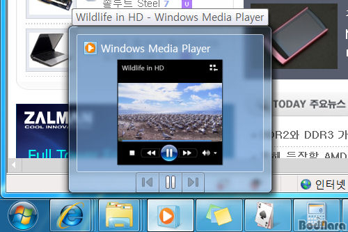 À©µµ¿ì 7ÀÇ ÀÛ¾÷ Ç¥½ÃÁÙ ¹× ½ÃÀÛ ¸Þ´º ¼Ó¼ºÀ» º¸¸é ºü¸¥ ½ÇÇà ¿É¼ÇÀÌ »ç¶óÁø ´ë½Å À©µµ¿ì XP³ª ºñ½ºÅ¸¿¡ ¾ø¾ú´ø »õ·Î¿î ¿É¼Ç Çϳª°¡ Ãß°¡µÇ¾ú´Âµ¥, ¹Ù·Î ¹ÙÅÁ ȸéÀ» Åõ¸íÇÏ°Ô º¼ ¼ö ÀÖ°Ô ÇØÁÖ´Â ¿¡¾î·Î ÇÈ(Aero Peek)ÀÌ´Ù.