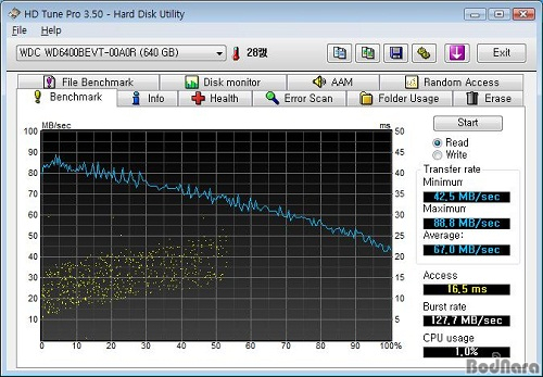 HD Tach Å×½ºÆ® °á°úµµ ¸¶Âù°¡Áö·Î Æò±Õ Àü¼Û ¼Óµµ¿¡¼´Â 320GB Ç÷¡Å͸¦ »ç¿ëÇÑ WD ½ºÄÝÇÇ¿À ºí·ç 640GB¿Í 250GB Ç÷¡Å͸¦ »ç¿ëÇÑ WD ½ºÄÝÇÇ¿À ºí·ç 500GBÀÇ Â÷À̰¡ Å©Áö ¾Ê¾ÒÁö¸¸ ·£´ý ¾×¼¼½º ¼Óµµ¿¡¼´Â WD ½ºÄÝÇÇ¿À ºí·ç 640GBÀÌ WD ½ºÄÝÇÇ¿À ºí·ç 500GB¿¡ ºñÇØ »ó´çÈ÷ Å« Â÷ÀÌ·Î ºü¸¥ ¼Óµµ¸¦ º¸¿©ÁÖ°í ÀÖ¾î ÀüüÀûÀ¸·Î º¼ ¶§ ¼º´ÉÇâ»óÀÌ ÀÌ·ç¾îÁø °ÍÀ» È®ÀÎÇÒ ¼ö ÀÖ¾ú´Ù.
