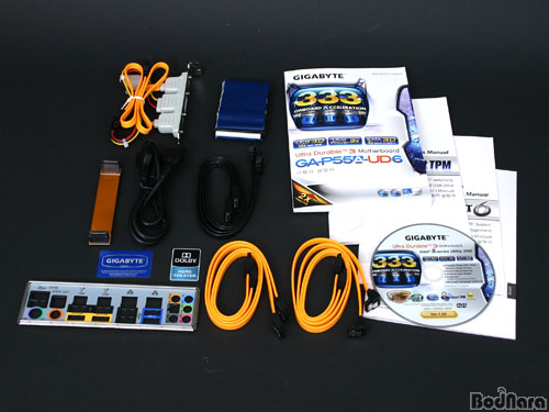 GA-P55A-UD6 ¿Ü¿¡ Ãß°¡ ±¸¼º¹°Àº GA-P55-UD6¿Í µ¿ÀÏÇϰÔ, SATA µ¥ÀÌÅÍ ÄÉÀ̺í°ú eSATA ºê¶óÄÏ, SLI ÄÉÀ̺í, I/O ½Çµå, ¸Å´º¾ó, µå¶óÀ̹ö¿Í À¯Æ¿¸®Æ¼°¡ ¼ö·ÏµÈ DVDµîÀÌ Á¦°øµÈ´Ù.