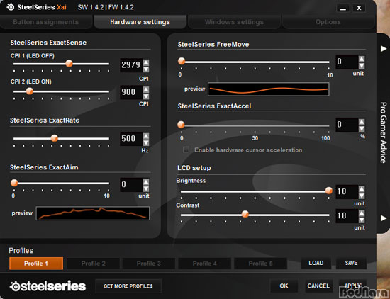 'Çϵå¿þ¾î ¼ÂÆÃ °ª' ÅÇ¿¡¼´Â CPII(CPI : Count per inch, DPI·Î Ç¥½ÃÇϱ⵵ ÇÔ)ÀÇ º¯°æ ¹× Polling rate(ExactRate, ÀÀ´ä·ü)ÀÇ º¯°æÀ» 1´ÜÀ§·Î º¯°æÀÌ °¡´ÉÇÏ¸ç ¼¾¼ÀÇ ºÒ¾ÈÁ¤ º¸Á¤À» À§ÇÑ ExactAim¸Þ´º°¡ Á¦°øµÇ°í ÀÖ´Ù.