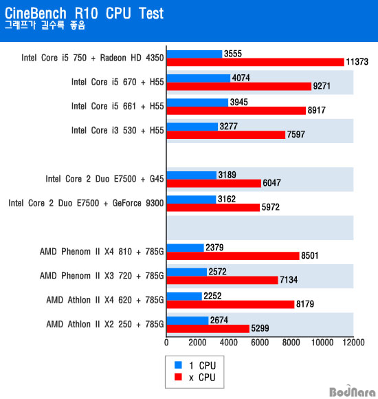 CineBench R10 º¥Ä¡¸¶Å© °á°ú¸¦ »ìÆìº¸¸é ½Ì±Û ÇÁ·Î¼¼¼­(1 CPU) ·»´õ¸µ ¼º´ÉÀº µ¿ÀÛ Å¬·°¿¡ ¿µÇâÀ» ¹ÞÁö¸¸ ¸ÖƼ ÄÚ¾î(x CPU) Å×½ºÆ®¿¡¼­ ³×ÀÌÆ¼ºê Äõµå ÄÚ¾îÀÎ ¸°Çʵå ÄÚ¾î i5-750ÀÌ HT ±â´ÉÀ» °¡Áø µà¾ó ÄÚ¾î Ŭ¶ôµ¥ÀϺ¸´Ù ³ôÀº ¼º´ÉÀ» ³ªÅ¸³Â´Ù. ÄÚ¾î 2 µà¿À E7500 ½Ã½ºÅÛÀº 1 CPU´Â ÄÚ¾î i3-530°ú ºñ½ÁÇÑ ¼öÁØÀ̾úÁö¸¸, x CPU Å×½ºÆ®¿¡¼­ HT¸¦ Áö¿øÇÏ´Â i3-530º¸´Ù ³·Àº ¼º´ÉÀ» º¸¿´´Ù.