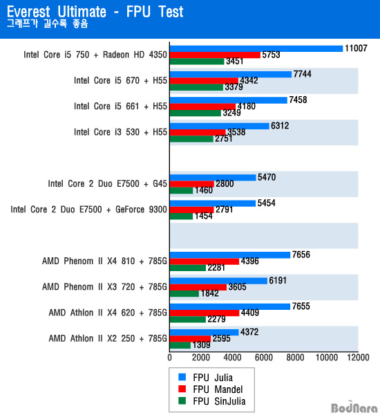 Everest UltimateÀÇ FPU Å×½ºÆ® °á°ú´Â ¸°ÇÊµå ±â¹Ý ÄÚ¾î i5-750ÀÌ °¡Àå ³ôÀº ¼º´ÉÀ» º¸¿´À¸¸ç, Ŭ¶ôµ¥ÀÏ ½Ã¸®Áî°¡ ±× µÚ¸¦ À̾ú´Ù. ÄÚ¾î i5-600 ½Ã¸®Áî´Â AMD Äõµå ÄÚ¾î ½Ã¸®Áî¿Í ºñ½ÁÇÑ °á°ú¸¦ ³ªÅ¸³Â°í, µ¿ÀÛ Å¬·°ÀÌ ¶³¾îÁö´Â ÄÚ¾î i3-530Àº À̺¸´Ù ´Ù¼Ò ³·Àº ¼º´ÉÀ» º¸¿´´Ù.