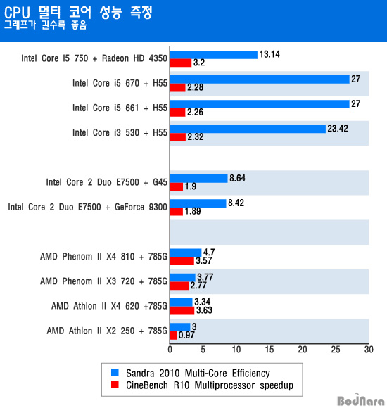 Ŭ¶ôµ¥ÀÏÀ» Äõµå ÄÚ¾î(½º·¹µå) ±âÁØÀ¸·Î º»´Ù¸é È¿À²¼ºÀÌ ¶³¾îÁö´Â °ÍÀÌÁö¸¸ µà¾ó ÄÚ¾î ±âÁØÀ¸·Î º¸¸é ÀÏ¹Ý µà¾ó ÄÚ¾î ÇÁ·Î¼¼¼­¿¡ ºñÇØ HT·Î ÀÎÇØ ¸ÖƼ ÄÚ¾î È¿À²¼ºÀÌ ´õ ³ô´Ù´Â Àǹ̸¦ °®±â ¶§¹®¿¡ Sandra¿Í CineBench ¸ðµÎ Ŭ¶ôµ¥ÀÏÀÇ ¸ÖƼ ÄÚ¾î ¼º´ÉÀÌ ÁÁ´Ù°í Ç¥½ÃÇÏ´Â °ÍÀÌ´Ù.