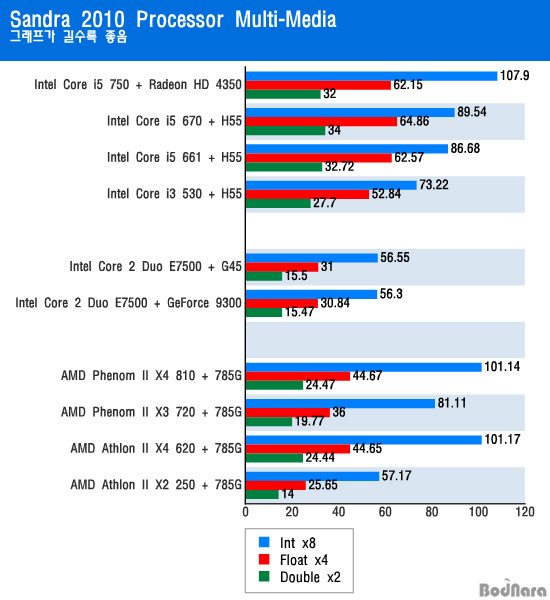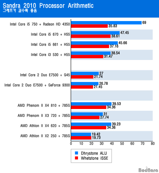 Sandra 2010c ÇÁ·Î¼¼¼­ ¸ÖƼ¹Ìµð¾î ¼º´É ÃøÁ¤ ¿ª½Ã Á¤¼ö¿¬»ê(Int)Àº ¸°Çʵå¿Í Ŭ¶ôµ¥ÀÏÀÇ Â÷À̰¡ Å©Áö¸¸ ºÎµ¿¼Ò¼öÁ¡ ¿¬»ê¿¡¼­´Â Arithmetic °á°ú¿Í µ¿ÀÏÇÑ ¼ø¼­·Î ³ªÅ¸³­´Ù. ÄÚ¾î i3-530°ú °°Àº µ¿ÀÛ Å¬·°À» °¡Áø ÄÚ¾î 2 µà¿À E7500ÀÇ °æ¿ì HT ¹ÌÁö¿ø ¹× Å×½ºÆ® ½Ã½ºÅÛÀÇ DDR2-800MHz ¸Þ¸ð¸® ±¸¼º µîÀ¸·Î i3-530º¸´Ù ³·Àº ¼º´ÉÀ» ±â·ÏÇß´Ù.