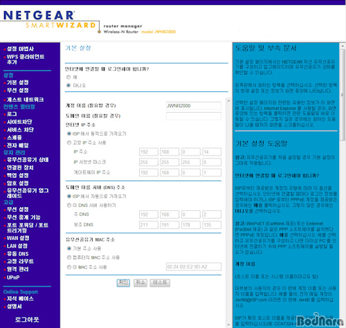 JWNR2000¿¡¼­ Á¦°øÇÏ´Â CD¸¦ ³Ö°í, ÀÚµ¿ ½ÇÇà È­¸é¿¡¼­ [¼³¸í¼­]¸¦ Ŭ¸¯ÇÏ¸é ¶ß´Â ½º¸¶Æ®À§Àúµå È­¸éÀ¸·Î, ISPÃø ¶óÀΰú ¸ðµ©, À¯¹«¼± °øÀ¯±âÀÇ ¿¬°á ¹æ½ÄÀ» º¸¿©ÁÖ¸ç, ¼ø¼­´ë·Î µû¶óÇÏ¸é ±âº»ÀûÀÎ ¹«¼± ¼³Á¤ÀÌ ¿Ï·áµÈ´Ù. ¿©±â¼­´Â ÀÎÅÍ³Ý ¿¬°á½Ã ·Î±×ÀÎ À¯¹«/ IP ÁÖ¼Ò ÇÒ´ç ¹æ½Ä/ DNS ÁÖ¼Ò/ MAC ÁÖ¼Ò/ SSID/ º¸¾È ¿É¼ÇµîÀ» ¼³Á¤ÇÒ ¼ö ÀÖÀ¸¸ç, ÀÌµé °ªÀº °ü¸®ÀÚ ¸ðµå¿¡¼­ Àç¼³Á¤ °¡´ÉÇÏ´Ù.