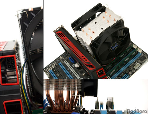À§ »çÁøÀº Àϰö °³ÀÇ È®Àå ½½·Ô Áß Ã¹ ¹øÂ° È®Àå ½½·ÔÀÌ ±×·¡ÇÈ Ä«µå ÀåÂøÀ» À§ÇÑ PCIe 2.0 x16 ½½·ÔÀÎ ¾Æ¼ö½º P7P55D µð·°½º ¸ÞÀκ¸µå¿¡ ÆÛÆ÷¸¶¸¦ ÀåÂøÇÑ ¸ð½ÀÀÌ´Ù. ÀÌ °æ¿ì ÆÛÆ÷¸¶¿Í ±×·¡ÇÈ Ä«µå°£ÀÇ °£°ÝÀÌ Á¼¾Æ ±×·¡ÇÈ Ä«µåÀÇ ¹ß¿­ÀÌ ÆÛÆ÷¸¶¿¡ ¿µÇâÀ» ³¢Ä¥ ¼ö ÀÖÀ¸¹Ç·Î, °¡´ÉÇÑ ±×·¡ÇÈ Ä«µå ÀåÂøÀ» À§ÇÑ PCIe x16 ½½·ÔÀÌ µÎ ¹øÂ° È®Àå ½½·Ô¿¡ À§Ä¡ÇÑ ¸ÞÀκ¸µå¸¦ »ç¿ëÇÏ´Â °ÍÀÌ ¹ß¿­ °ü¸®¸é¿¡ À̵æÀÌ µÉ °ÍÀ̸ç, RAMÀÇ ³ôÀ̰¡ 36mm ÀÌ»óÀ» °æ¿ì ÆÛÆ÷¸¶¿Í °£¼·ÀÌ ¹ß»ýÇÒ ¿©Áö°¡ ÀÖÀ¸¹Ç·Î »ç¿ëÀü È®ÀÎÀÌ ÇÊ¿äÇÏ´Ù.