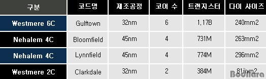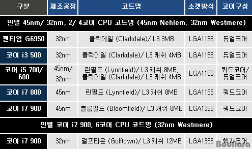 ÀÎÅÚÀº Ŭ¶ôµ¥ÀÏ (Clarkdale) ÇÁ·Î¼¼¼ºÎÅÍ 32nm °øÁ¤ÀÇ Westmere CPU¿Í 45nm GPU¸¦ ÅëÇÕÇϰí ÀÖÀ¸¸ç, ±âÁ¸ ¸°Çʵå (Lynnfield)¿Í ºí·ëÇʵå (Bloomfield)´Â 45nm °øÁ¤À» Àû¿ëÇÑ´Ù. ÀÎÅÚ µ¥½ºÅ©Å¾ 6ÄÚ¾îÀÇ ÄÚµå¸íÀº °ÉÇÁŸ¿î (Gulftown)À¸·Î L3 ij½¬°¡ 4MB ´õ ´Ã¾î³ª°í ÄÚ¾î ¼öµµ 2°³ Áõ°¡, 32nm Westmere ±â¹Ý CPU´Ù.