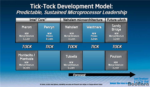 ÀÎÅÚÀÇ °æ¿ì ƽÅå Àü·«À» ¹ÙÅÁÀ¸·Î ÇÑ ¹øÀº °øÁ¤À» °³¼± (Tock)Çϰí ÇѹøÀº ¾ÆÅ°ÅØÃ³ (Tick)¸¦ °³¼±ÇØ¿À°í ÀÖ´Ù. ÀÎÅÚÀÇ 6ÄÚ¾î °ÉÇÁŸ¿îÀº ƽ (Tick)¿¡ ÇØ´çÇÏ´Â CPU·Î ³×ÇÒ·½ ¾ÆÅ°ÅØÃ³ÀÇ 45nm °øÁ¤¿¡¼ 32nm ¿þ½ºÆ®¹Ì¾î (Westmere)·Î °øÁ¤À» °³¼±ÇÏ´Â ÇÁ·Î¼¼¼´Ù. ³»³â¿¡´Â 32nmÀÇ »õ·Î¿î ¾ÆÅ°ÅØÃ³ÀÎ »÷µð ºê¸´Áö (Sandy Bridge)°¡ µîÀåÇÒ °ÍÀ¸·Î ¾Ë·ÁÁø »óÅ´Ù.
