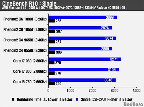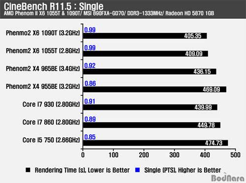 CineBench R10/ R11.5´Â ¸ÖƼ½º·¹µå ȯ°æÀ» Á¦´ë·Î Áö¿øÇÏÁö¸¸, ½Ì±Û½º·¹µå ȯ°æ¿¡ µû¸¥ CPUÀÇ Ã³¸® ¼º´Éµµ ºñ±³ÇÒ ¼ö ÀÖ´Ù. ½Ì±Û½º·¹µå ȯ°æÀÇ °æ¿ì ¸ÖƼÄÚ¾î CPU¸¦ °®Ãß°í ÀÖ´õ¶óµµ ¸ÖƼ½º·¹µå¸¦ Áö¿øÇÏÁö ¸øÇØ ÄÚ¾î ÇϳªÀÇ Å¬·°°ú CPU ÀÚüÀÇ ¿¬»ê ¼º´É¿¡ µû¶ó Â÷À̸¦ º¸ÀÌ°Ô µÈ´Ù.