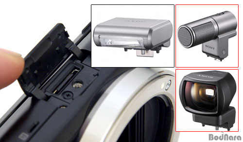 NEX-5´Â Ç÷¡½Ã¸¦ ³»ÀåÇÏ´Â ´ë½Å »ó´Ü¿¡ ½º¸¶Æ® ¾×¼¼¼¸® Å͹̳ÎÀ̶ó°í ºÒ¸®´Â ´Ù¸ñÀû ¾×¼¼¸® ¿¬°áºÎ°¡ ¸¶·ÃµÇ¾î ÀÖ´Ù. ¿©±â¿¡´Â Ä«¸Þ¶ó ÇÔ²² ±âº» Á¦°øµÇ´Â Ç÷¡½Ã ¿Ü¿¡µµ º°µµ·Î ÆÇ¸ÅµÇ´Â Àü¿ë ¾×¼¼¼¸®µéÀ» ÀåÂøÇÒ ¼ö ÀÖ´Ù.