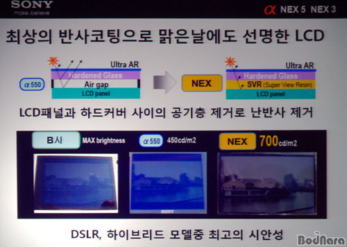 NEX ½Ã¸®Áî¿¡ µé¾î°£ LED ¹é¶óÀÌÆ® Æ®·çºí·¢ LCD´Â ÀÏ¹Ý LCD°¡ º¸È£ Ä¿¹ö »çÀÌ¿¡ °ø±âÃþÀÌ »ý°Ü ³¹Ý»ç°¡ ¹ß»ýÇÏ´ø ¹®Á¦¸¦ ÇØ°áÇϱâ À§ÇØ °ø±âÃþÀ» SVR(Super View Resin)À̶ó´Â ÀÏÁ¾ÀÇ ÇÕ¼º¼öÁö·Î ä¿ö¼ ³¹Ý»ç¸¦ Á¦°ÅÇÏ°í ½Ã¾È¼ºÀ» Çâ»ó½ÃÄ×´Ù.