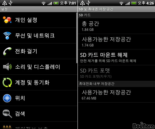 ÀúÀå °ø°£Àº º¸µå³ª¶ó¿¡¼ ¹ÞÀº Á¦Ç°ÀÌ HTC »ùÇÃÀ̱⠶§¹®¿¡ ÀÏ¹Ý ÆÇ¸Å Á¦Ç°°ú ´Ù¸¦ ¼ö Àִµ¥, ÃʱâÈ Á÷ÈÄ ³»ºÎ ÀúÀå°ø°£Àº ¾à 85MB Á¤µµ·Î ³²¾ÆÀÖ¾ú´Ù. HTC °ø½Ä ½ºÆåÀÎ 576MB¿Í ´Ù¸¥ ÀÌÀ¯´Â Sense À§Á¬À» Æ÷ÇÔÇÑ ¿©·¯ °¡Áö ¾ÛµéÀÌ ¹Ì¸® ¼³Ä¡µÇ¾î Àֱ⠶§¹®ÀÎ °ÍÀ¸·Î º¸ÀδÙ.