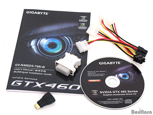 »ùÇ÷ΠÁ¦°øµÈ ±â°¡¹ÙÀÌÆ® GeForce GTX 460 768MBÀÇ ºÎ¼Ó¹°Àº »ç¿ëÀڸŴº¾ó, µå¶óÀ̹ö CD 1Àå, 6ÇÉ to 4ÇÉ º¸Á¶Àü¿ø ÄÉÀ̺í 2°³, DVI to D-SUB º¯È¯Àè, Mini HDMI to HDMI º¯È¯ÀèÀÌ Æ÷ÇԵǾî ÀÖ´Ù.