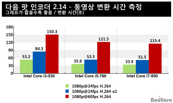 ¸ð¹ÙÀÏ ±â±â¿ë µ¿¿µ»ó ÀÎÄÚµù¿¡ ¸¹ÀÌ »ç¿ëµÇ´Â ´ÙÀ½ ÆÌ ÀÎÄÚ´õ ¿ª½Ã HT¸¦ Áö¿øÇÏÁö ¾Ê±â ¶§¹®¿¡ ÄÚ¾î i5-760°ú ÄÚ¾î i7-950ÀÇ µ¿¿µ»ó º¯È¯ ½Ã°£Àº Å©°Ô Â÷À̳ªÁö ¾Ê¾Ò´Ù. ¹Ý´ë·Î µà¾ó ÄÚ¾î(2C/4T) ÇÁ·Î¼¼¼ÀÎ ÄÚ¾î i3-530Àº È®½ÇÈ÷ ´Ù¸¥ ½Ã½ºÅÛº¸´Ù ÀÎÄÚµù¿¡ °É¸®´Â ½Ã°£ÀÌ ´Ã¾î³µ´Ù.