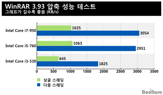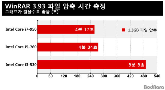 WinRARÀÌ ÀÎÅÚ HT ±â¼úÀ» Áö¿øÇÏÁö ¾Ê±â ¶§¹®¿¡ ÄÚ¾î ¼ýÀÚ°¡ Àý¹ÝÀÎ i3-530 ÇÁ·Î¼¼¼´Â µ¿ÀÛ Å¬·°ÀÌ 2.93GHz·Î ÄÚ¾î i5-760º¸´Ù ³ôÀ½¿¡µµ ºÒ±¸ÇÏ°í ¾ÐÃà ½Ã°£Àº 2¹è¿¡ °¡±î¿î 8ºÐ´ë¸¦ ±â·ÏÇß´Ù.