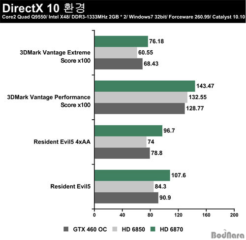 Å×½ºÆ® °á°ú ±×·¡ÇÈ Ä«µå ¼º´ÉÀÇ ¿µÇâÀÌ ³ô¾ÆÁö´Â 3DMark Vantage Extreme¿¡¼´Â 3DMark Vantage Performance ¿¡¼¿Í ´Þ¸® HD 6850À» ¾Õ¼± ¼º´ÉÀ» º¸ÀÌ¸é¼ HD 6870°úÀÇ Â÷À̸¦ Á¼Çû°í, Resident Evil5¿¡¼´Â HD 6850º¸´Ù ³ôÀº ¼º´ÉÀ» º¸ÀδÙ.