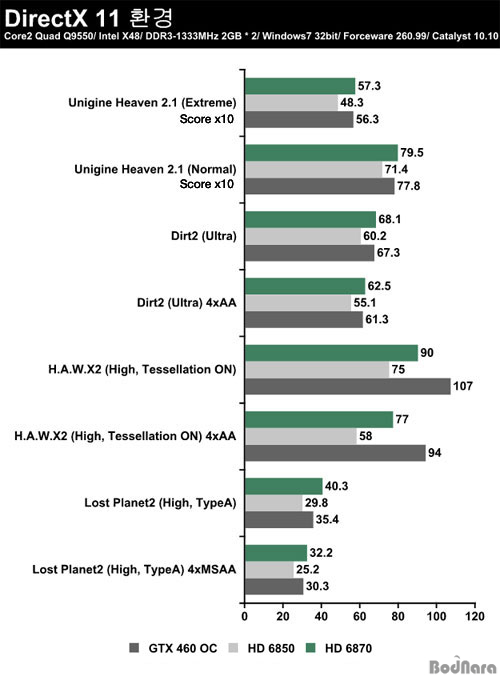DirectX 10 ȯ°æ¿¡¼¿Í ´Þ¸®, Å×½½·¹À̼ÇÀÌ °ÈµÈ DirectX 11 ȯ°æ¿¡¼´Â GTX 460 OC Á¦Ç°ÀÌ HD 6850À» Àü¹ÝÀûÀ¸·Î ¾Õ¼°í ÀÖÀ¸¸ç, °ø½Ã°¡°¡ Ãʱâ GTX 460 1GB Á¦Ç°°ú µ¿ÀÏÇÑ HD 6870°ú´Â ±ÙÁ¢Çϰųª ³ôÀº ¼º´ÉÀ» º¸¿©ÁØ´Ù.