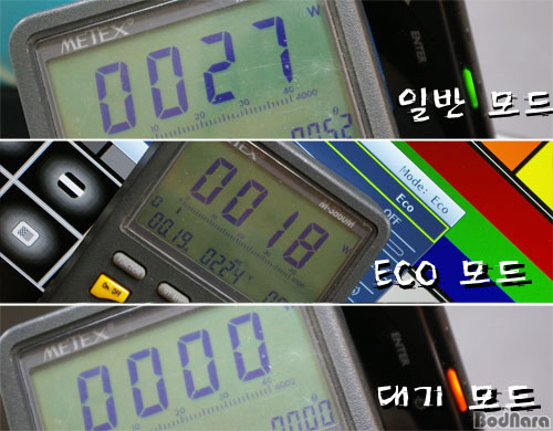 ½ÇÁ¦ ÃøÁ¤ÇØ º» ¼Òºñ Àü·ÂÀº 1W ´ÜÀ§·Î ¼Òºñ Àü·ÂÀ» ÃøÁ¤ÇÏ´Â ±â±âÀÇ Æ¯¼º»ó ´ë±â ¸ðµå¿¡¼ 0W·Î Ç¥½ÃµÈ °ÍÀ» Á¦¿ÜÇϸé ÀÏ¹Ý ¸ðµå¿Í ECO ¸ðµå ¸ðµÎ ½ºÆå»ó Àü·Â ¼Òºñ·®À» Á¤È®È÷ ÁؼöÇϸç, ´ë±â ¸ðµå½Ã ¼Òºñ Àü·Â ¶ÇÇÑ ½ºÆå°ú Å« Â÷ÀÌ´Â ¾øÀ» °ÍÀ¸·Î ÆÇ´ÜµÈ´Ù.