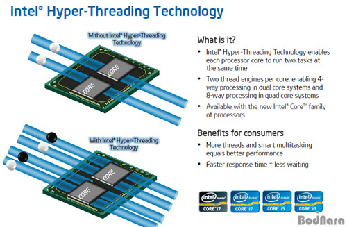 ÇÏÀÌÆÛ½º·¹µùÀº SMT (Simultaneous Multi-Threading) ±â¼úÀÇ ÀÏÁ¾À¸·Î ¹°¸®ÄÚ¾î (½ÇÁ¦ ÄÚ¾îÁõ°¡)¸¦ ´Ã¸®´Â °ÍÀÌ ¾Æ´Ñ ³í¸®ÄÚ¾î (½ÇÁ¦ ÄÚ¾î´Â À¯Áö)¸¦ ´Ã·Á ¼º´ÉÀ» ´Ã¸®´Â ¹æ¹ýÀ¸·Î ³×ÇÒ·½ ¸¶ÀÌÅ©¾ÆÅ°ÅØÃ³¿¡¼´Â ÄÚ¾î Å©±â°¡ 4-5% ´Ã¾î³ª´Â ´ë½Å ÀϺΠ¾ÖÇø®ÄÉÀ̼ǿ¡¼ ÃÖ´ë 40%ÀÇ ¼º´É Çâ»óÀÌ °¡´ÉÇÏ´Ù°í ¹àÈ÷°í ÀÖ´Ù. ÇÏÁö¸¸, ÇÏÀÌÆÛ½º·¹µùÀº ÀÌÀü¿¡µµ »ìÆìº» °Íó·³ ¼º´É ÀúÇϰ¡ ¹ß»ýÇÒ ¼öµµ ÀÖ°í Áö¿ø ¿î¿µÃ¼Á¦µµ ÇÊ¿äÇÏ´Ù.