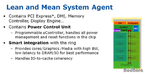 »÷µðºê¸´Áö¿¡´Â System Agent·Î ºÒ¸®´Â »õ·Î¿î À¯´ÖÀÌ Æ÷ÇԵǴµ¥ ¿©±â¿¡´Â PCIe ¹ö½º ÄÁÆ®·Ñ·¯¿Í DMI, ¸Þ¸ð¸® ÄÁÆ®·Ñ·¯, µð½ºÇ÷¹ÀÌ ¿£Áø µî °ÅÀÇ ¸ðµç ¿ÜºÎ ÀÎÅÍÆäÀ̽º°¡ Æ÷ÇԵȴÙ. ³×ÇÒ·½ÀÇ ¾ðÄÚ¾î ºÎ¿Í À¯»çÇϳª L3 ij½¬¸¦ Æ÷ÇÔÇÏÁö ¾ÊÀº °ÍÀÌ Â÷ÀÌ´Ù. ÀÌ °³º° À¯´ÖÀº »÷µðºê¸´Áö ÇÁ·Î¼¼¼ µ¿ÀÛŬ·°À¸·Î µ¿À۵Ǹç, ¸µ¹ö½º¸¦ ÅëÇØ ÇÁ·Î¼¼¼¿Í ±×·¡ÇÈÄÚ¾î °£ÀÇ µ¥ÀÌÅÍ ±³È¯ÀÌ ÀÌ·ç¾îÁ® ±âÁ¸º¸´Ù È¿À²ÀÌ ³ô¾ÆÁø´Ù.