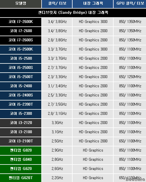 »÷µðºê¸´Áö µ¥½ºÅ©Å¾ ¹öÀüÀº ½¦ÀÌ´õ ÇÁ·Î¼¼¼ Áï, ½ÇÇàÀ¯´Ö (EU, Execution Units)À» 6°³ Á¦°øÇÏ´Â HD Graphics 2000°ú 12°³°¡ Á¦°øµÇ´Â HD Graphics 3000, ÆæÆ¼¾ö°ú ¼¿·¯·Ð¿¡´Â HD GraphicsÀÇ 3°¡Áö°¡ µîÀåÇÒ °ÍÀ¸·Î ¾Ë·ÁÁ® ÀÖÀ¸¸ç, ³ëÆ®ºÏÀº 12°³ÀÎ HD Graphics 3000ÀÌ Á¦°øµÈ´Ù. µ¥½ºÅ©Å¾¿ëÀ¸·Î HD Grahpics 3000ÀÌ Àû¿ëµÇ´Â Á¦Ç°µéÀº ¹è¼ö¶ôÀÌ ÇØÁ¦µÈ ÄÚ¾î i7 2600K¿Í ÄÚ¾î i5 2500KÀÇ 2Á¾ÀÌ ¾Ë·ÁÁ® ÀÖ´Ù.