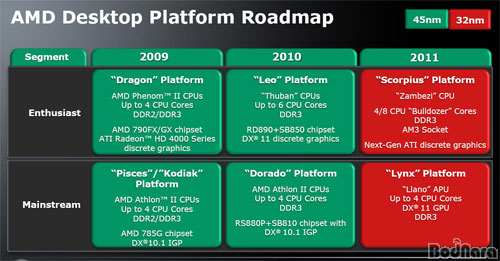 2010³â ¶óÀξ÷À» ÀÕ´Â 2011³â ¶óÀξ÷Àº 32nm °øÁ¤À» ±â¹ÝÀ¸·Î »õ·Î¿î ¾ÆÅ°ÅØÃ³¸¦ Àû¿ëÇÏ´Â ºÒµµÀú¿Í ¹äĹÀÌ ÀÖÀ¸¸ç, CPU¿Í GPU°¡ ÇϳªÀÇ ´ÙÀÌ¿¡ ³»ÀåµÇ´Â Ç»Àü APUÀÎ ¶ó³ë (Llano)ÀÇ 3°¡Áö°¡ µîÀåÇÒ °ÍÀ¸·Î ¾Ë·ÁÁ® ÀÖ´Ù.
