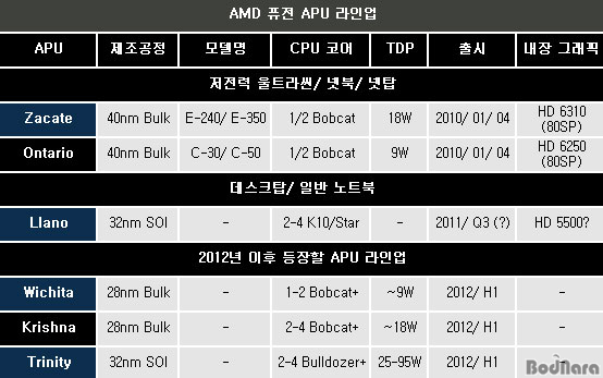AMDÀÇ 2010³â ¶óÀξ÷À» ÀÕ´Â 2011³â ¶óÀξ÷Àº »õ·Î¿î ¾ÆÅ°ÅØÃ³°¡ Àû¿ëµÇ´Â 32nm ±â¹ÝÀÇ ºÒµµÀú (Bulldozer)¿Í ¹äĹ (Bobcat), Ç»Àü (Fusion) APU·Î Á¤¸®µÉ ¼ö ÀÖ´Ù.
